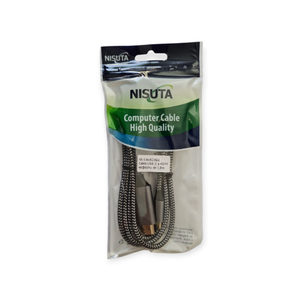 El cable Nisuta USB-C 3.1 a HDMI permite conectar dispositivos modernos con puerto USB-C (como notebooks, tablets y smartphones) a pantallas, televisores o proyectores con entrada HDMI, garantizando una transmisión de video y audio de alta calidad. Con soporte para resolución 4K a 60Hz, ofrece imágenes nítidas y fluidas, ideal para presentaciones, entretenimiento y uso profesional.
