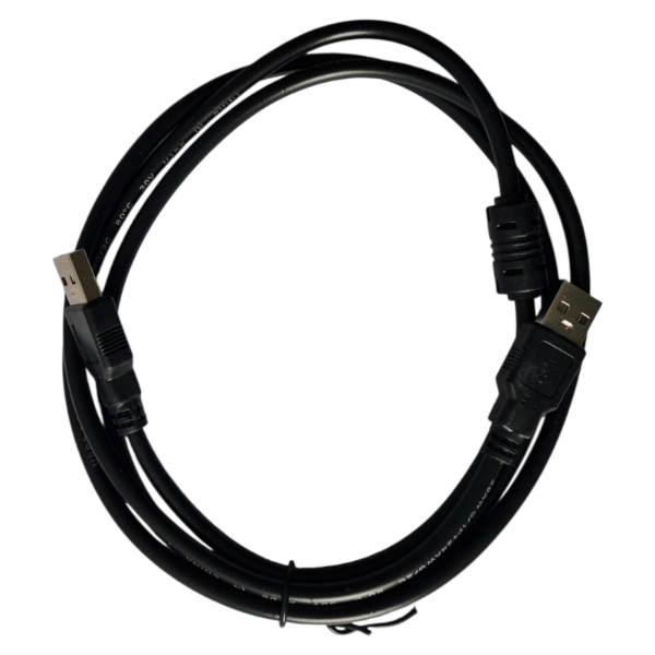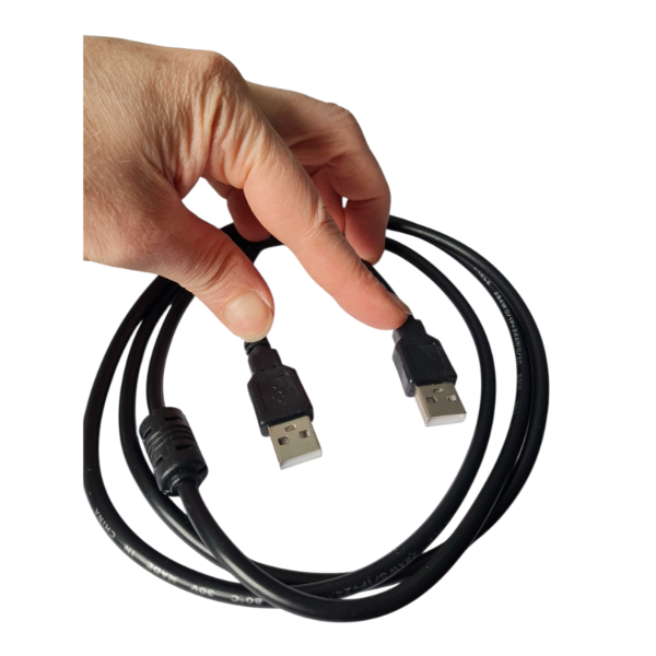 Cable de conexión con conectores USB Tipo A macho en ambos extremos. Diseñado para transferencia de datos y alimentación entre dispositivos compatibles.