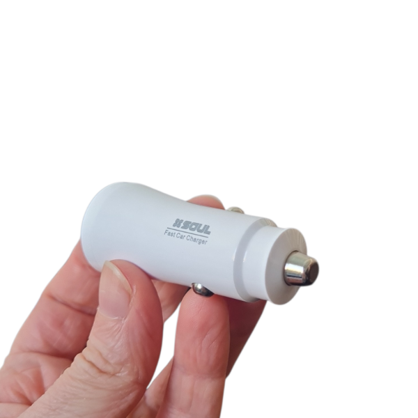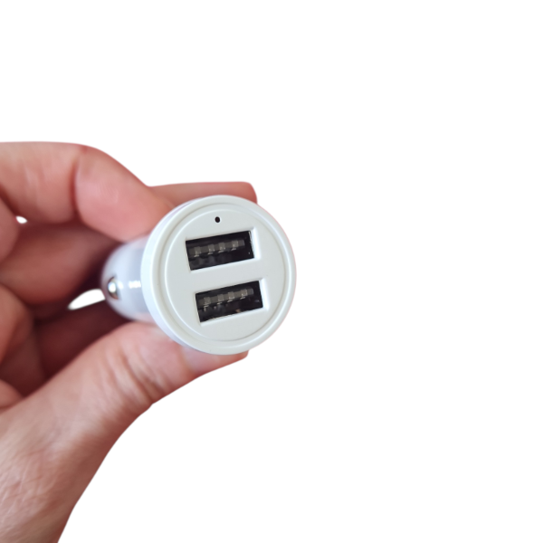 Cargador para automóvil, diseñado para brindar energía confiable y segura a tus dispositivos mientras viajás. Su diseño compacto y moderno incluye dos puertos USB, permitiendo cargar dos equipos al mismo tiempo.