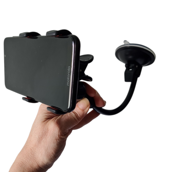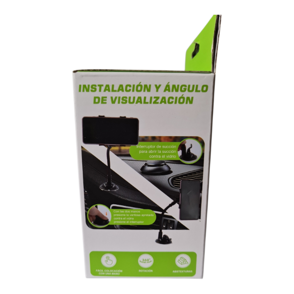 Este soporte de celular para coche está diseñado con ventosa de alta fijación y brazo flexible, permitiendo ajustar el ángulo de visión de manera cómoda y segura. Su sistema de rotación de 360° ofrece libertad total para colocar el dispositivo en la posición más conveniente durante la conducción.